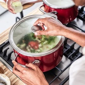 Derudover har gryden en kerne af stål, der er ideel til høj varme, da varmen fastholdes effektivt. Det emaljerede stål er holdbart, og håndtagene forbliver afkølede under brug, så du ikke brænder fingrene. Grydens buede kant sørger for, at du undgår dryp, når der hældes. Cookware gryden tåler opvaskemaskine og ovn op til 220° C.